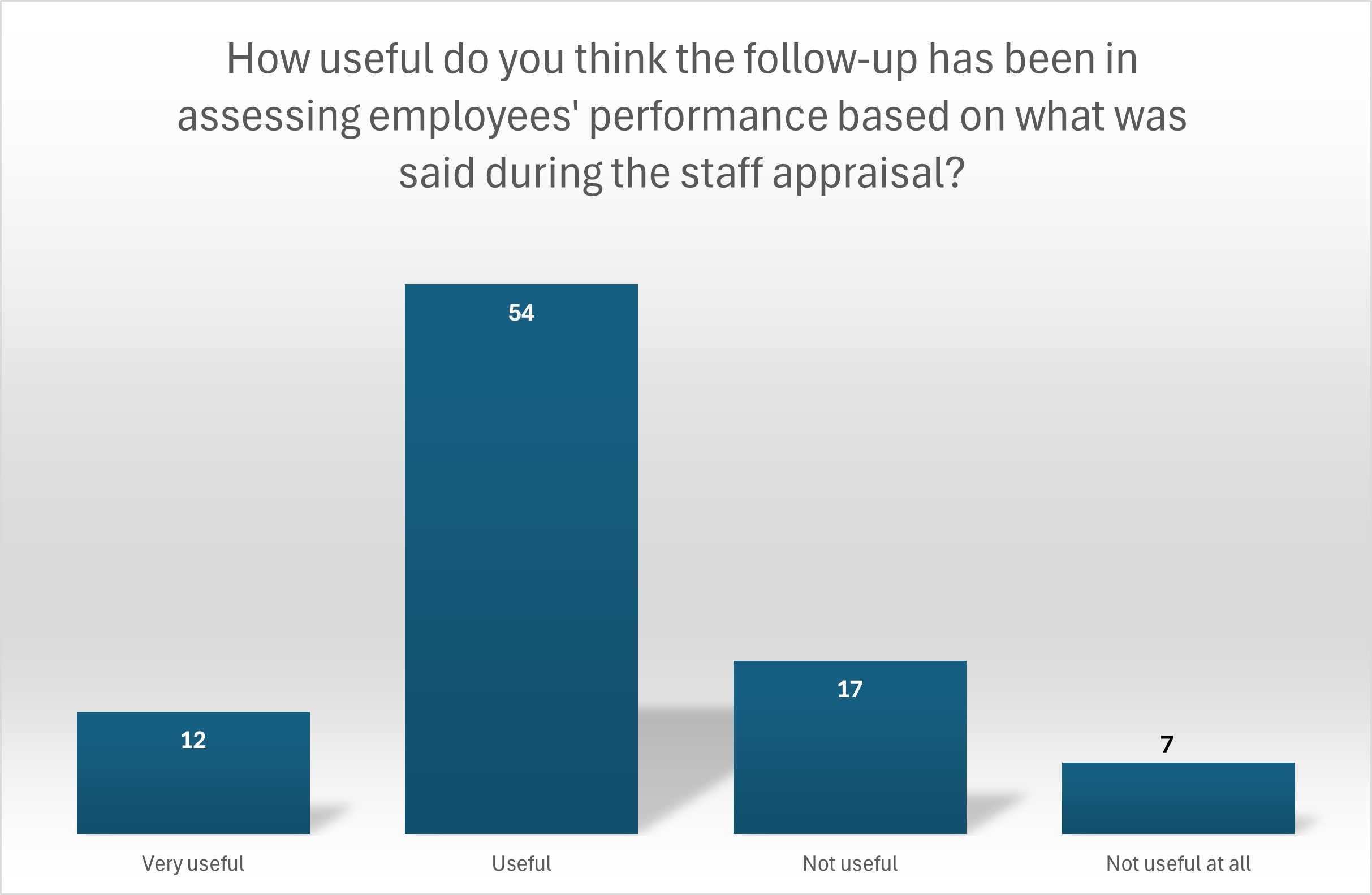 Managers generally find the staff appraisal useful in clarifying expectations of the employee for future follow-up. Both managers and employees appreciate the staff appraisal and it seems to be held widely across the organisation. When it comes to the follow-up, this was the most obvious process deficiency when all members were asked in the first survey. We could link the shortcoming in this process step to the subsequent failure of the salary-setting managers to justify the salary increase based on the salary-setting factors and the focus of the staff appraisal. Therefore, it is interesting to note that the managers' perception of the usefulness of the follow-up in assessing employees' performance is quite high.