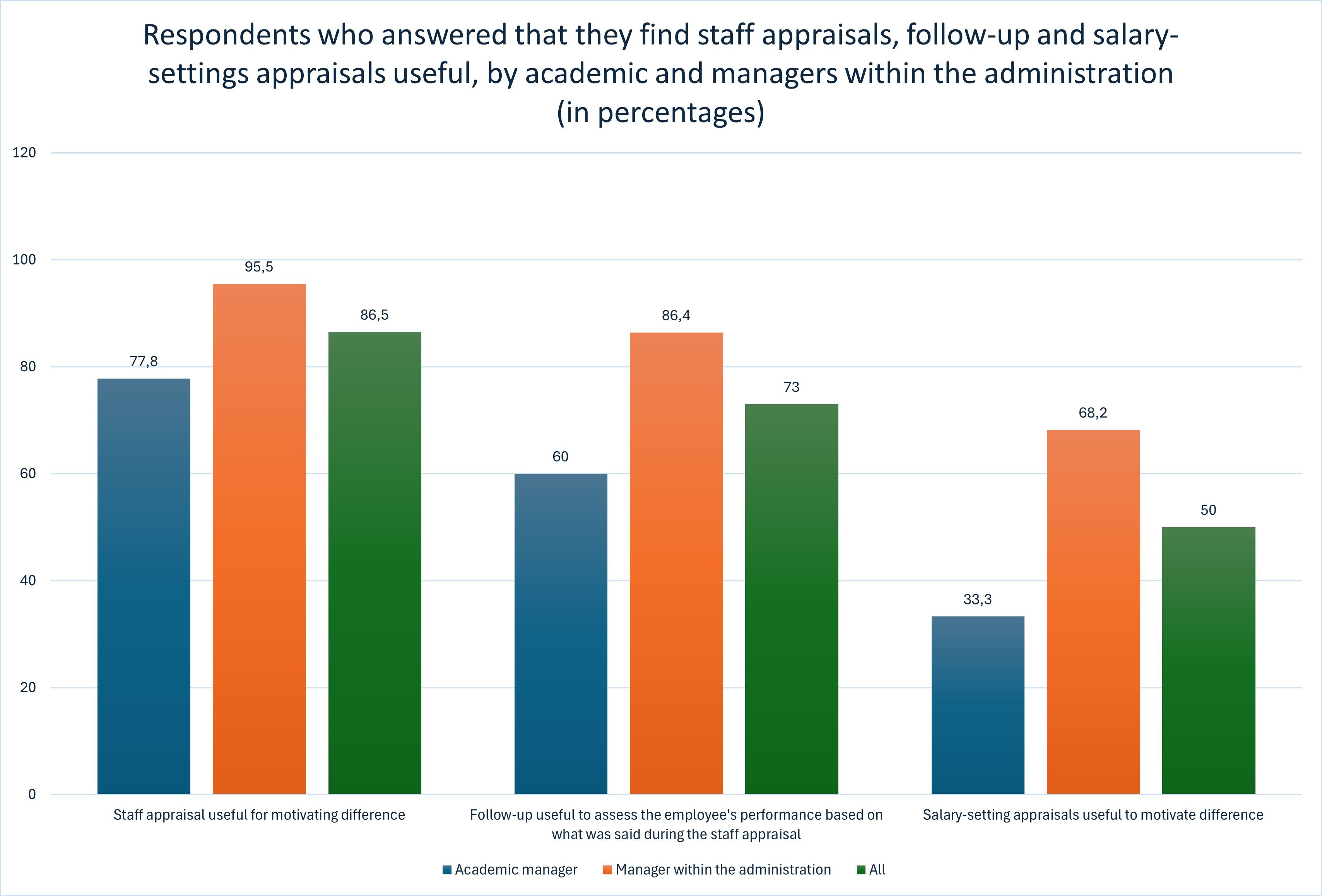 The results show that the difference between academic and administrative managers' views on the usefulness of the process increases during the process from staff appraisal to follow-up and finally salary-setting appraisals. Among academic managers, only 33% consider the salary-setting appraisals to be useful for justifying differences in individual salaries of different members. Moreover, only half of all managers consider it useful. It should not be forgotten that salary-setting managers who have completed the three steps have the full power to set salary for all our members, and yet they do not find the salary-setting appraisals useful. We will return in the full report to an in-depth discussion of this based on the managers' free text responses.