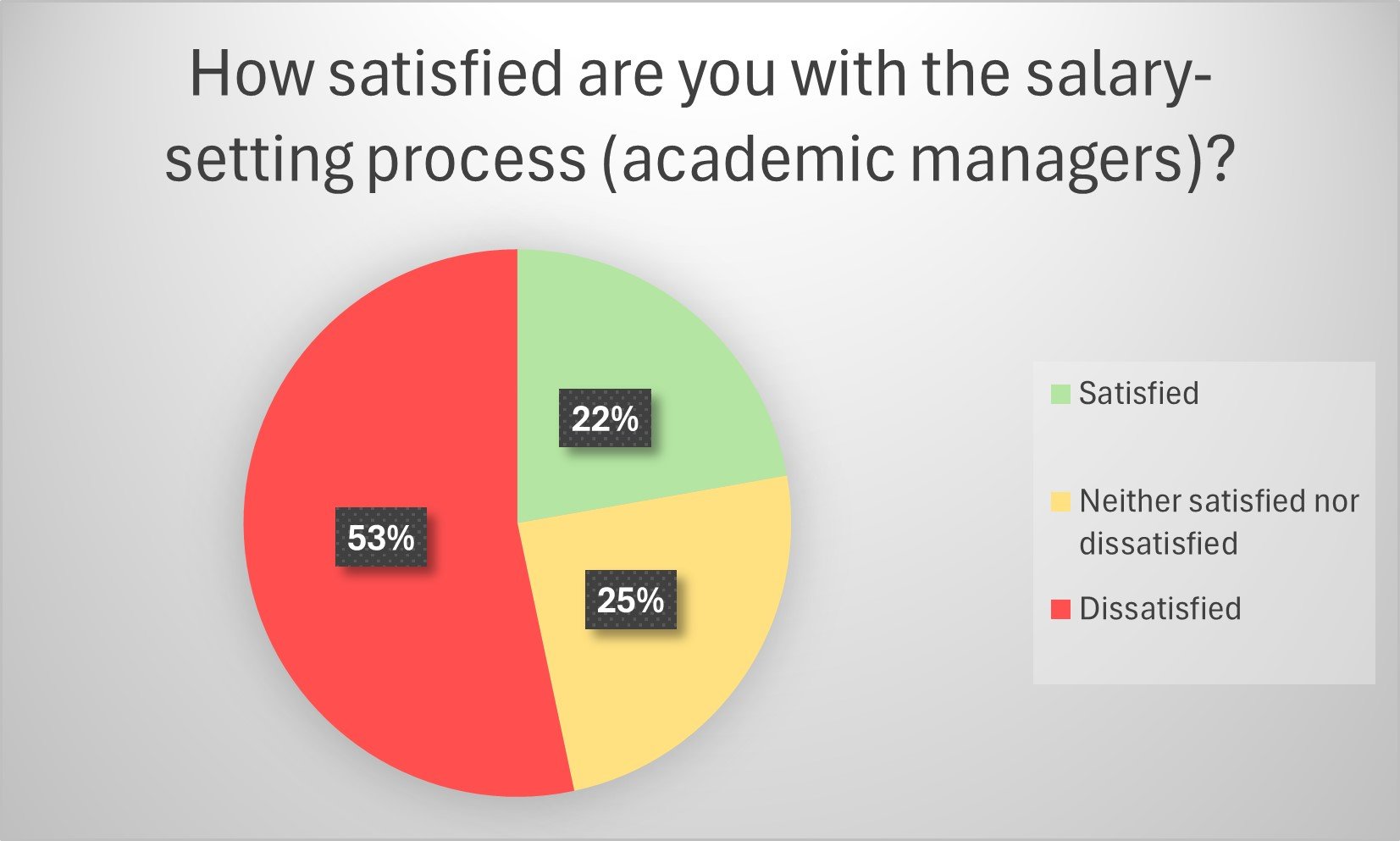 This shows that more than half (53%) of collegially elected academic managers are dissatisfied with the salary-setting process, while 25% are neither satisfied nor dissatisfied with the process, and only 22% are satisfied. Academic managers are collegially elected managers of core businesses in the faculties. In the survey of all members, many felt sorry that managers were forced to undertake a process that takes so much time and delivers so little. We therefore asked how managers would like the salary-setting process to be done if there were no salary-setting appraisals.