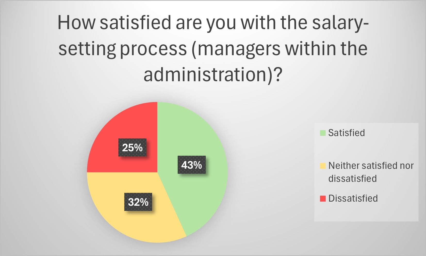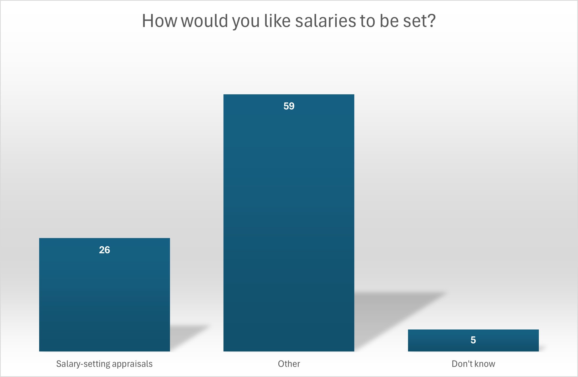 Of the 365 members in salary-setting positions who received the survey, 101 responded. In the survey to all members, we have previously observed that employees do not want to have salary-setting appraisals. Regardless of what kind of process shortcomings employees perceive, the free text responses made it clear that they are not satisfied with the current process and a very large number of them indicated that they would prefer the union to negotiate or that a tariff system be introduced.